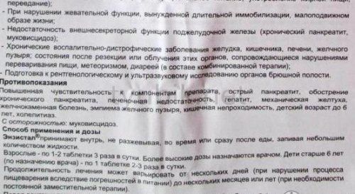 - Заместительная терапия при внешнесекреторной недостаточности поджелудочной железы: хронический панкреатит, панкреатэктомия, состояние после облучения, диспепсия, муковисцидоз, метеоризм, диарея неинфекционного генеза. — Нарушение усвоения пищи (состояние после резекции желудка и тонкого кишечника); — для улучшения переваривания пищи у лиц с нормальной функцией ЖКТ в случае погрешностей в питании (употребление жирной пищи, большого количества пищи, нерегулярное питание) и при нарушениях жевательной функции, малоподвижном образе жизни, длительной иммобилизации. — Синдром Ремхельда (гастрокардиальный синдром). — Подготовка и рентгенологическому исследованию и УЗИ органов брюшной полости.