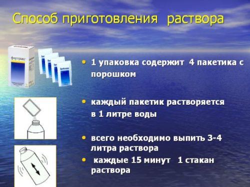 Готовить раствор рекомендуется в полном объеме, без предварительного растворения в небольшом количестве воды. Так, если по расчетам необходимо выпить 3 литра раствора Фортранса, средство разводят в соответствующем количестве воды.