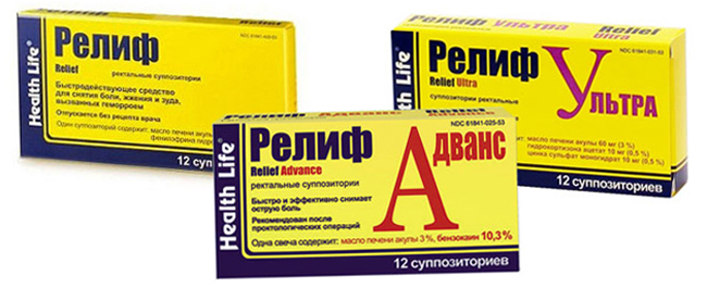 - Суппозитории, состоящие из масла акульей печени. К таким свечам можно отнести Релиф, позволяющий избавиться от наружного геморроя. Благодаря своему составу, препараты нормализуют кровотечение в венах, а также устраняют воспалительный процесс.
